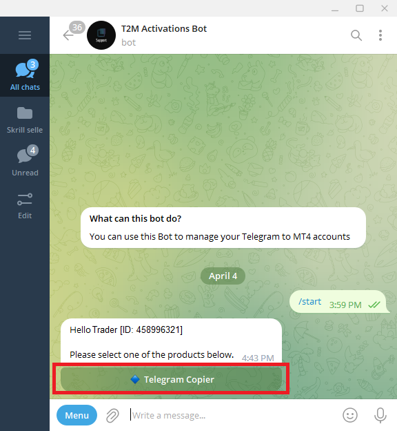 You will be greeted by the bot with the products purchased. to continue with the activation, select Telegram Copier (highlighted in red).