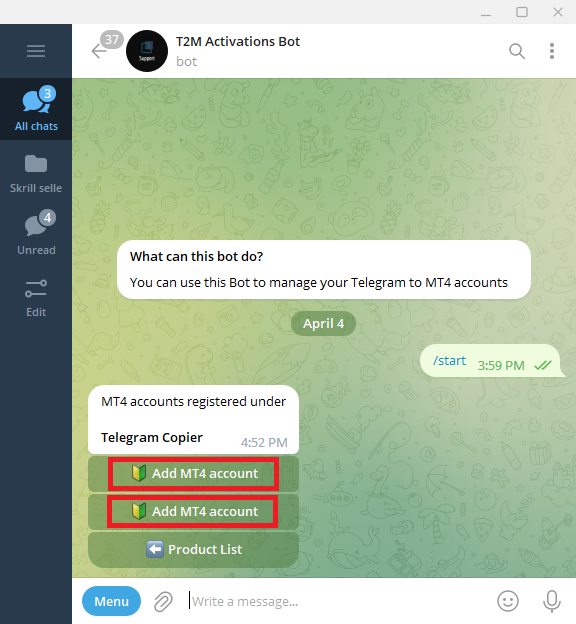 The T2M Activation Bot (@t2m_activations_bot) on telegram can be used to register/ update MT4/5 account numbers for the Telegram2MT4 copier by yourself.