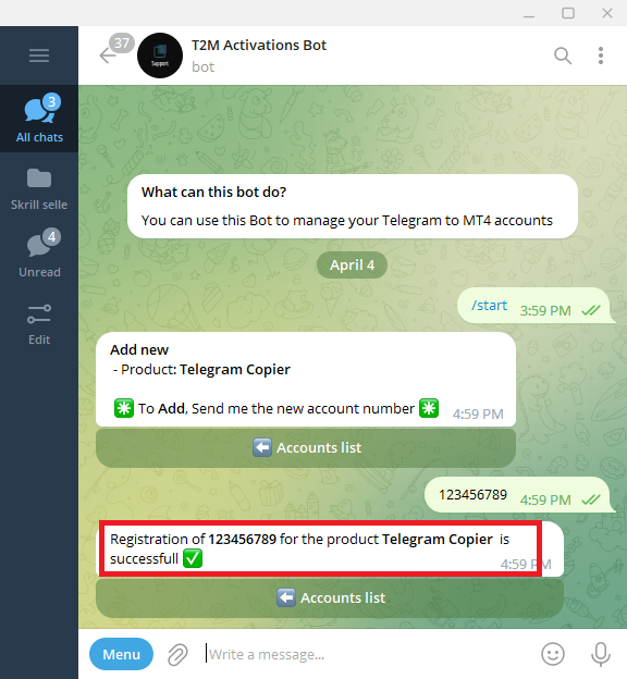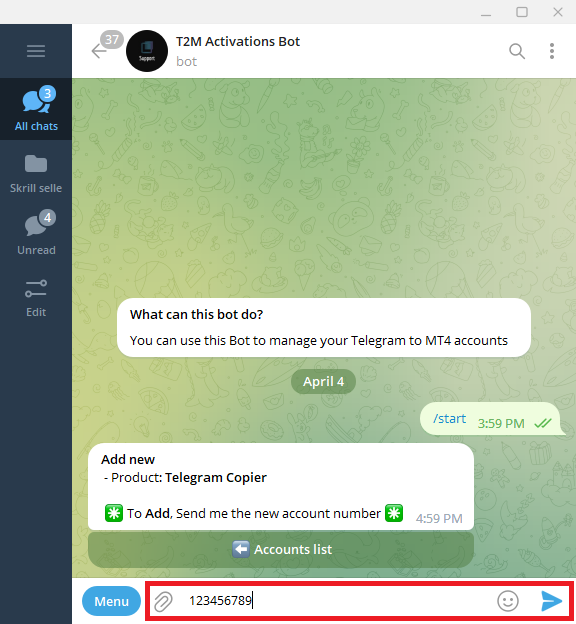 To add an account, Enter it in the message input as shown below and send the MT4/5 number to the bot.